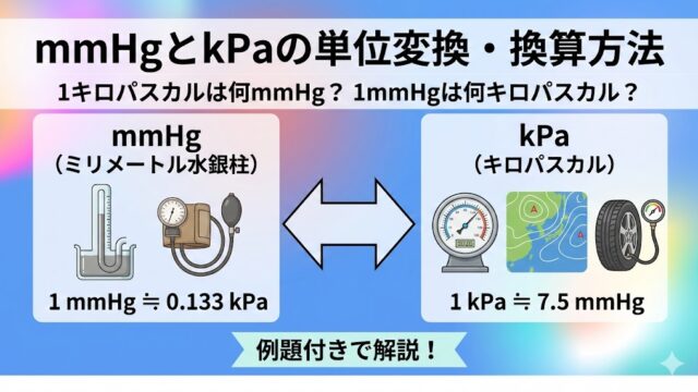 科学や計算関連 mmHgとkPaの単位変換・換算方法は?例題付きで解説!【1キロパスカルは何mmhg?1mmhgは何キロパスカル】 baskno02dy1 Excel・VBAマスターラボ 圧力を表す単位には、医療や科学の分野で使われるさまざまな種類があります。その中でも、mmHg(ミリメートル水銀柱)とkPa(キロパスカル)は …