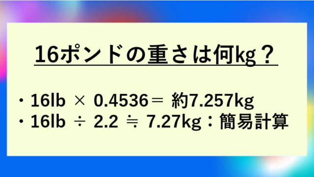 科学や計算関連 16ポンドの何キロ(kg)で何号か?【重さ:ボウリングやハンマー等!16lbsの単位換算・変換のコツも!】 umemori_wp Excel・VBAマスターラボ 「16ポンドって何キロになるの?」と疑問を感じたことはありませんか? ボウリングのボール選びをしているとき、海外製のハンマーや工具を検 …