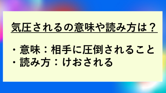 ビジネス・知識・教養 気圧されるの意味や読み方は?例文や使い方を徹底解説! umemori_wp Excel・VBAマスターラボ 日常会話や小説の中で、「気圧される」という表現を目にしたことはないでしょうか。 「気圧される」は、相手の迫力や雰囲気に圧倒されて萎縮し …