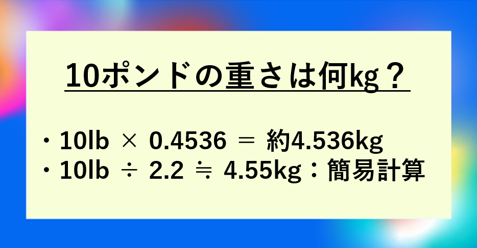 「10ポンド=約4.5kg」をベースに、「5ポンドならその半分で約2.3kg」「20ポンドなら2倍で約9kg」と応用すると暗算がより簡単になるでしょう。