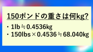 | 150lbs | 約68.04kg | 成人男性の平均体重くらい |