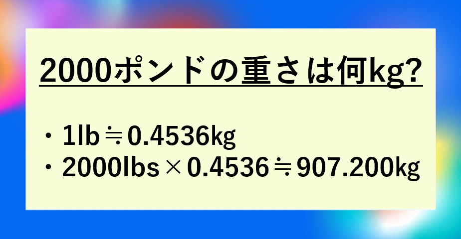 2000ポンド(2000lbs)は約907.18キログラム(kg)で、ほぼ907kgと覚えておくと非常に便利です。