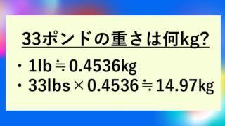 | 33lbs | 約14.97kg | 米袋(15kg)とほぼ同じ |