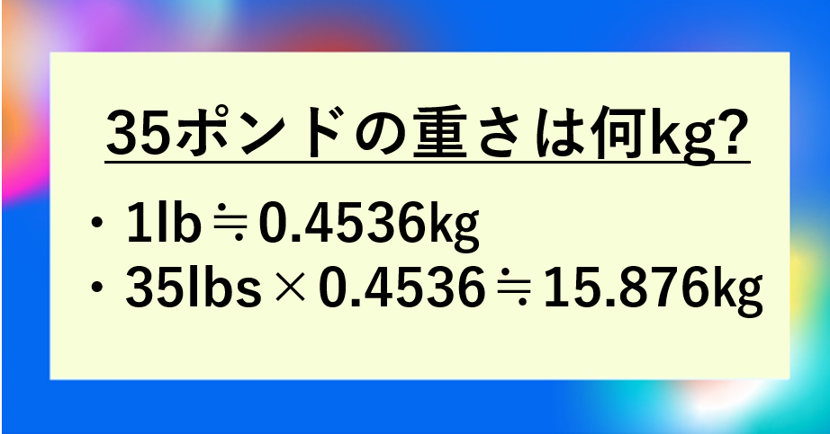 35ポンド(35lbs)は約15.88キログラム(kg)で、ほぼ16kgと覚えておくと非常に便利です。
