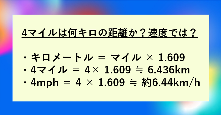 4マイルは約6.44kmで、1マイル=1.609kmをもとに計算する