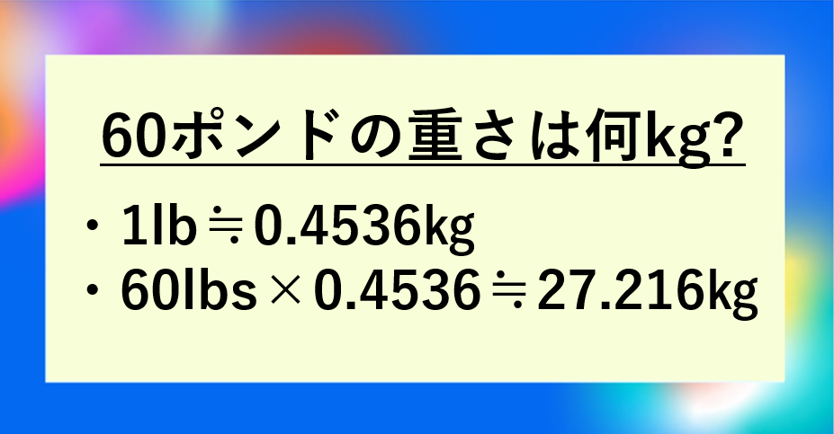 60ポンド(60lbs)は約27.22キログラム(kg)で、ほぼ27kgと覚えておくと非常に便利です。