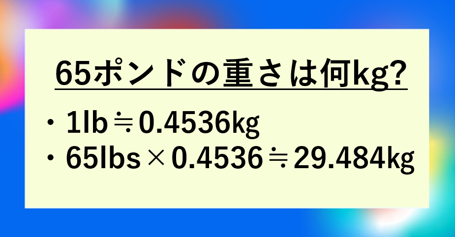 65ポンド(65lbs)は約29.48キログラム(kg)で、ほぼ30kgと覚えておくと非常に便利です。