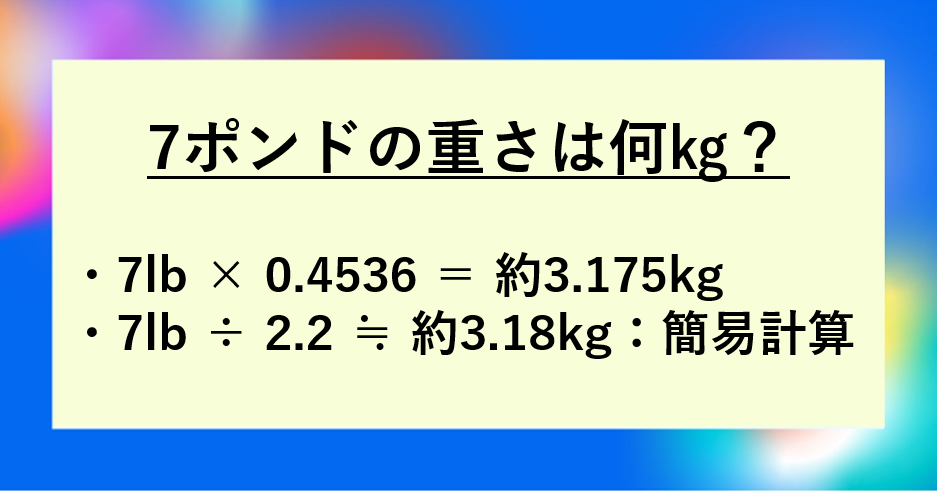 7lb × 0.4536 = 約3.175kg(正確な計算)素早く計算したい場合