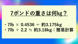 よく使われるポンド数とキログラムの対応を表にまとめました。8ポンド前後の数値もあわせて確認しておきましょう。