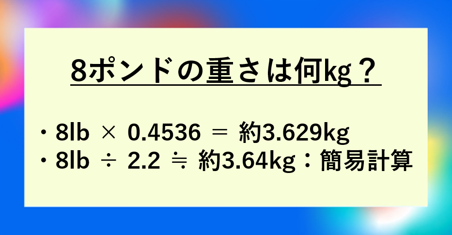 ポンド数 ÷ 2.2 = おおよそのkg8 ÷ 2.2 ≒ 3.64kg