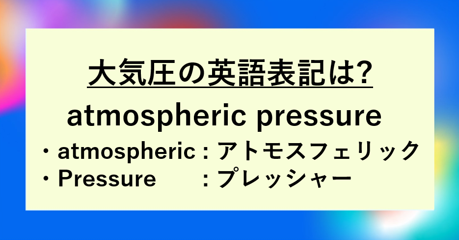 「atmospheric」が「大気の・大気に関する」という意味の形容詞であり、「pressure」が「圧力・圧」を意味する名詞。この2語を組み合わせることで「大気圧」という意味になるわけです。