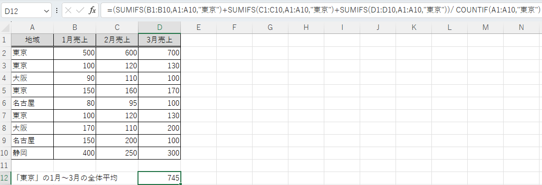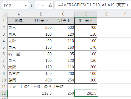 3月の平均:=AVERAGEIFS(D1:D10, A1:A10,“東京”)