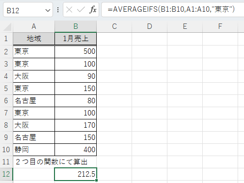 2月の平均:=AVERAGEIFS(C1:C10, A1:A10,“東京”)