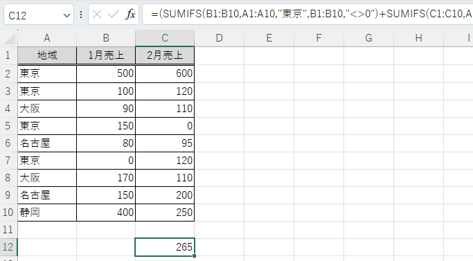 +SUMIFS(C1:C10,A1:A10,“東京”,C1:C10,”<>0”))