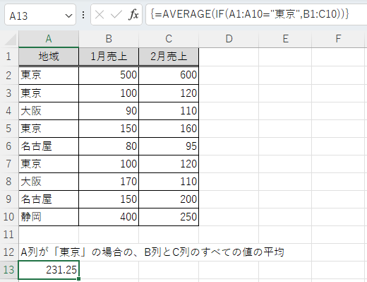 例)A列が「東京」の場合の、B列とC列のすべての値の平均を求める=AVERAGE(IF(A1:A10=“東京”,(B1:B10,C1:C10)))