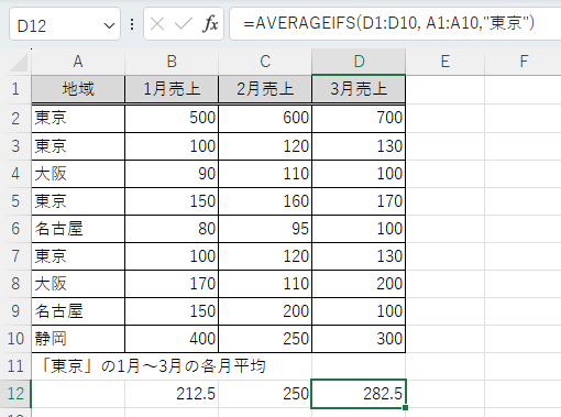 3月の平均:=AVERAGEIFS(D1:D10, A1:A10,“東京”)