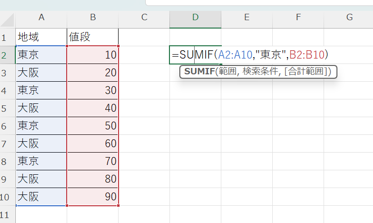 実際にスプレッドシートでSUMIF関数を入力する手順を確認してみましょう。たとえば、A列に地域名、B列に売上金額が入力されているデータで、「東京」の売上合計を求めるケースを想定します。