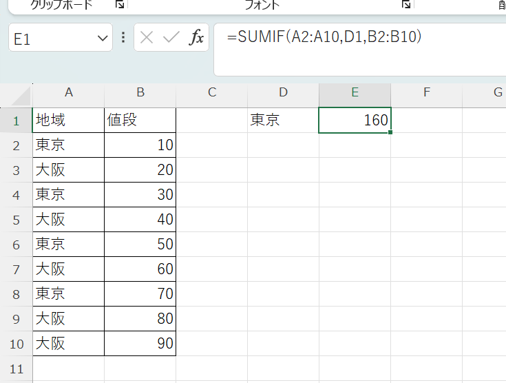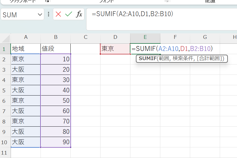 条件を直接数式に書き込むのではなく、セルを参照する形で書くと、条件を変えるだけで集計結果を切り替えられるため便利です。たとえばD1セルに「東京」と入力し、以下のように書きます。