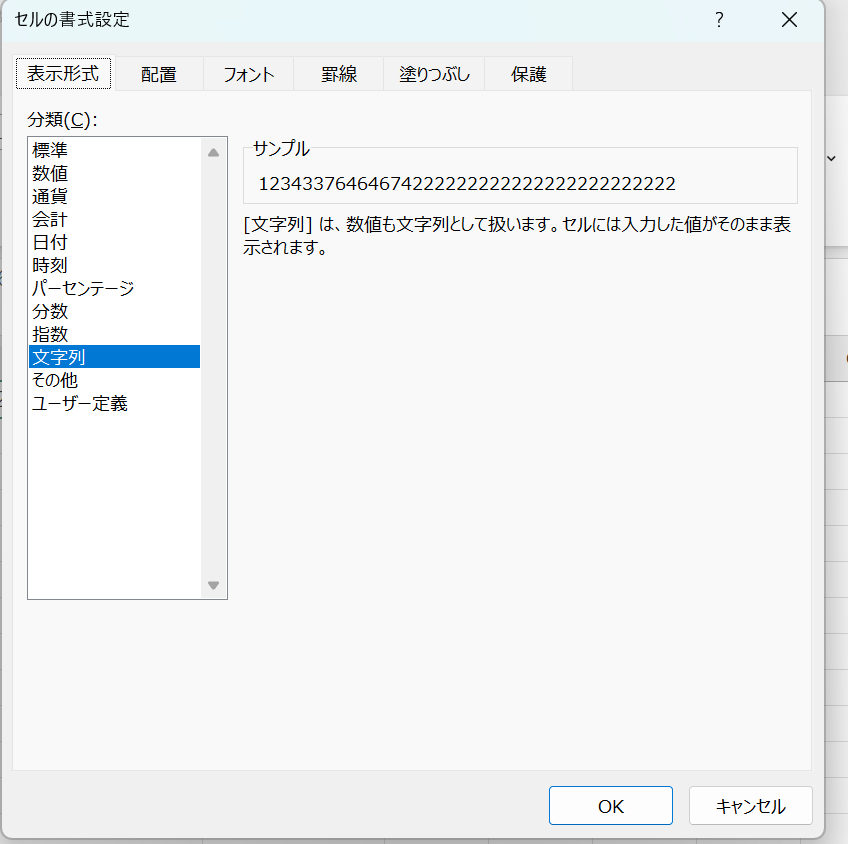 3. 「表示形式」タブ → 分類から「文字列」を選択