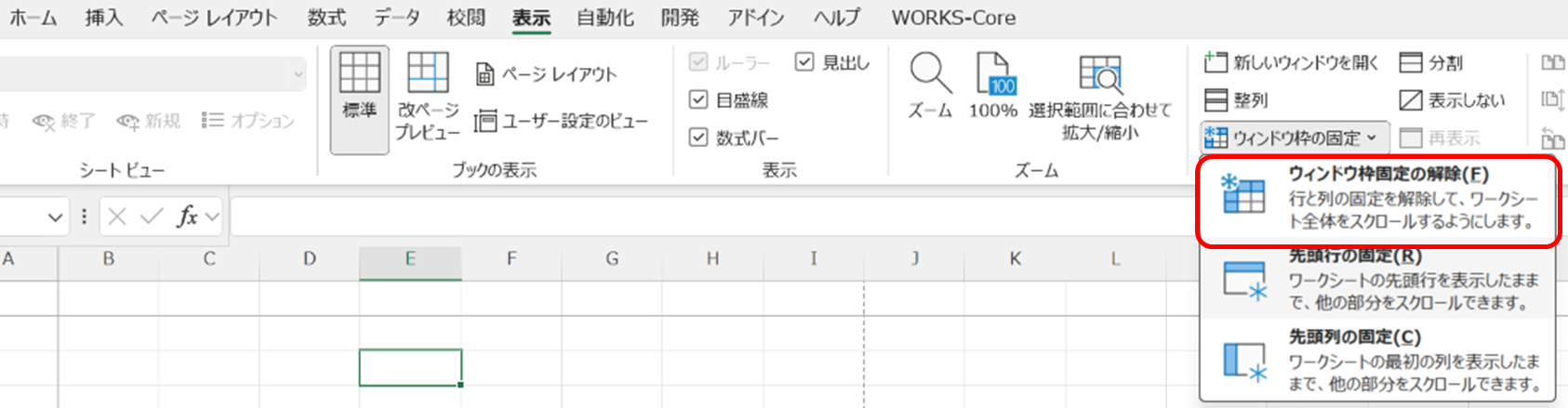 固定が設定されているときはメニューの表示が自動的に「ウィンドウ枠固定の解除」に切り替わります。同じ場所のメニューで設定と解除の両方が行えるため、迷わず操作できるでしょう。