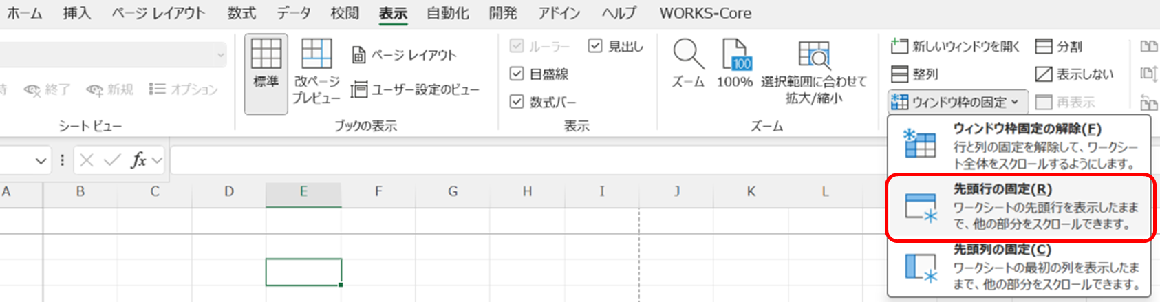 手順3:「先頭行の固定」「先頭列の固定」が表示されていれば未設定の状態