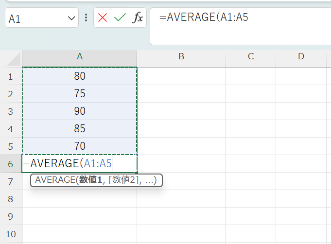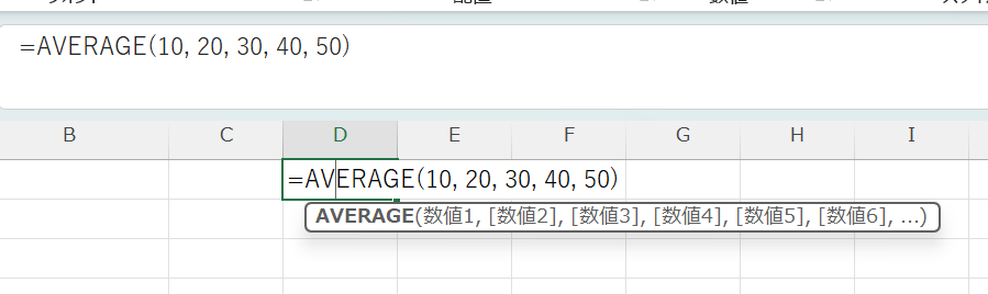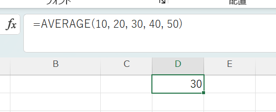 この書き方はテスト的な確認や、固定値の平均を求めたいときに便利です。ただし、数値が変わるたびに数式を修正する必要があるため、実務ではセル参照を使う方が管理しやすいでしょう。
