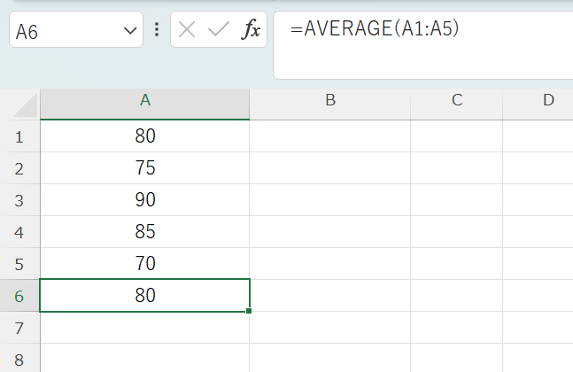 =AVERAGE(A1:A5)結果:80((80+75+90+85+70)÷ 5 = 80)