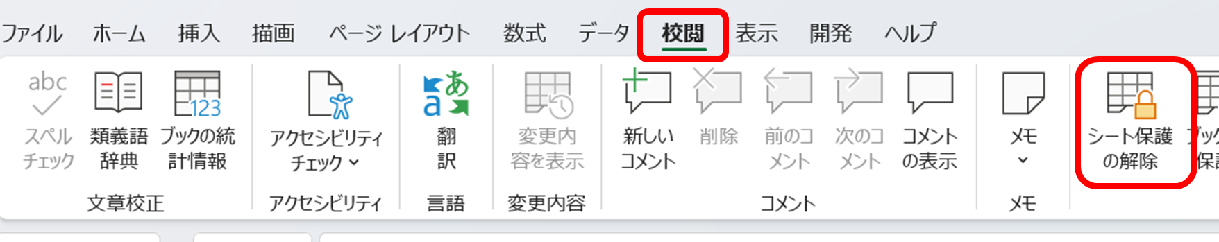 この場合は、メニューの「校閲」タブから「シート保護の解除」を選択することで元の状態に戻すことが可能です。