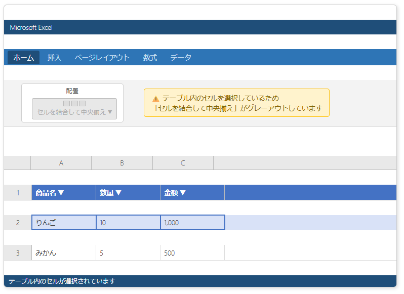 エクセルのテーブル機能(「挿入」→「テーブル」で作成した構造化テーブル)が設定されている範囲内では、セルの結合は原則として使用できません。