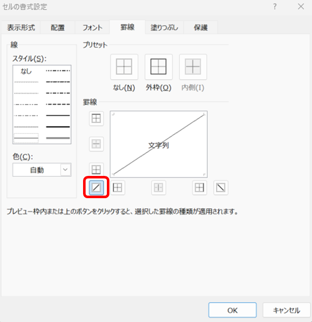 手順3:右下から左上、または左下から右上への斜線ボタンをクリックする