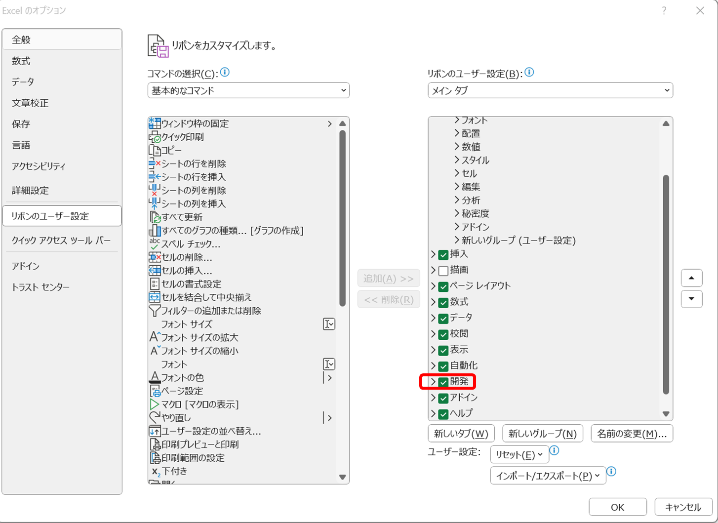 手順3:右側のリストにある「開発」にチェックを入れる。