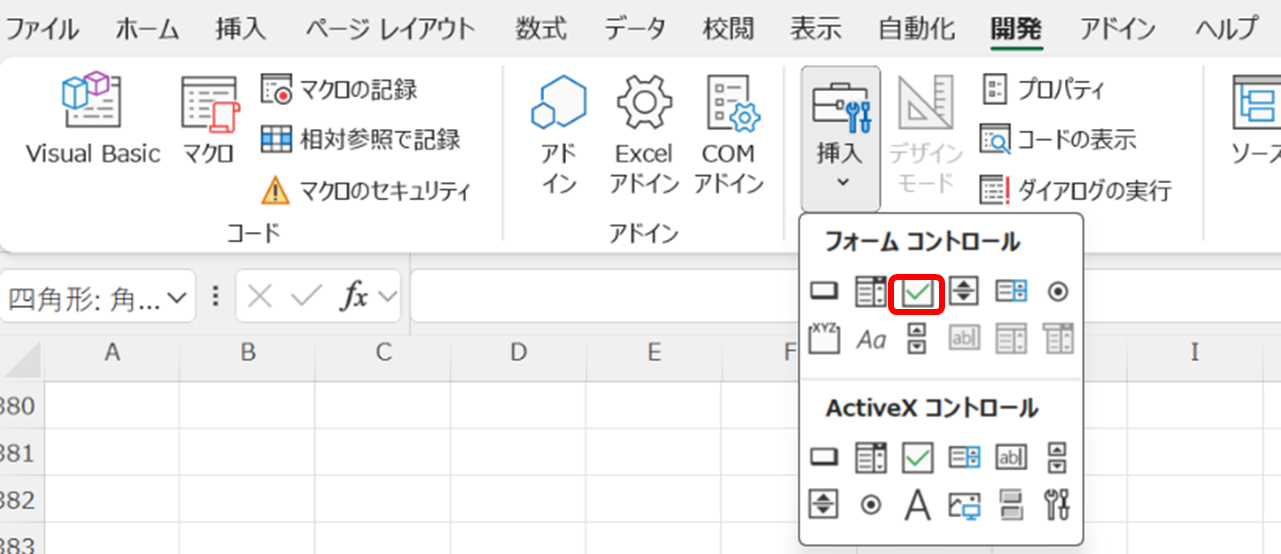 チェックボックスはエクセルの「開発」タブから挿入します。初期状態では開発タブが非表示になっている場合があるため、まず表示設定を確認しましょう。