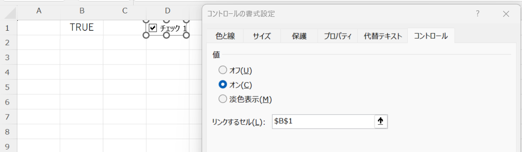 チェックボックスの状態(オン・オフ)をカウントするには、チェックボックスと特定のセルをリンクさせる必要があります。リンクされたセルにはチェックが入ると「TRUE」、外れると「FALSE」が自動的に表示されます。