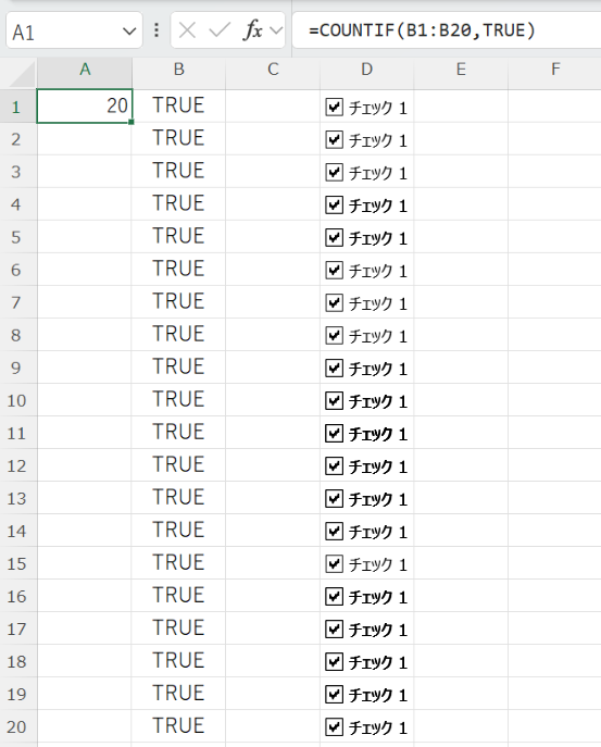| チェック済み件数 | =COUNTIF(B1:B20,TRUE) | チェックが入ったセルの個数 |