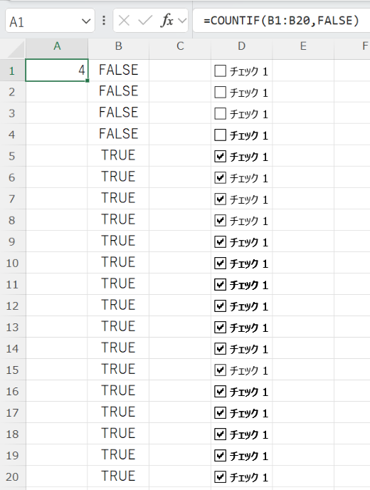 | 未チェック件数 | =COUNTIF(B1:B20,FALSE) | チェックが入っていないセルの個数 |