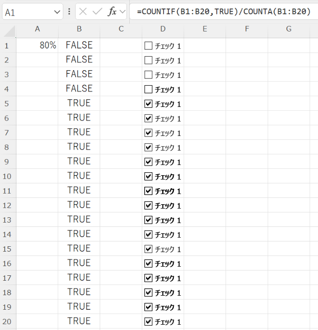 | 進捗率 | =COUNTIF(B1:B20,TRUE)/COUNTA(B1:B20) | チェック済みの割合(パーセント表示) |