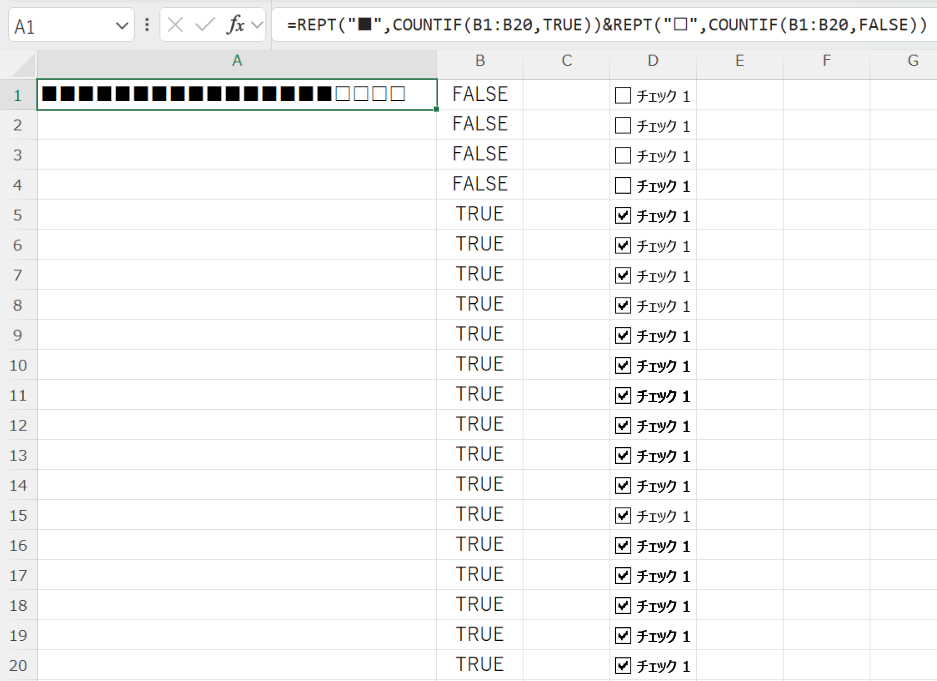 =REPT(“■”,COUNTIF(B1:B20,TRUE))&REPT(“□”,COUNTIF(B1:B20,FALSE))
