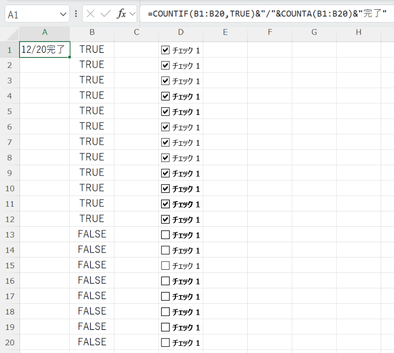 | 残件数 | =COUNTIF(B1:B20,FALSE) | まだチェックされていない件数 |