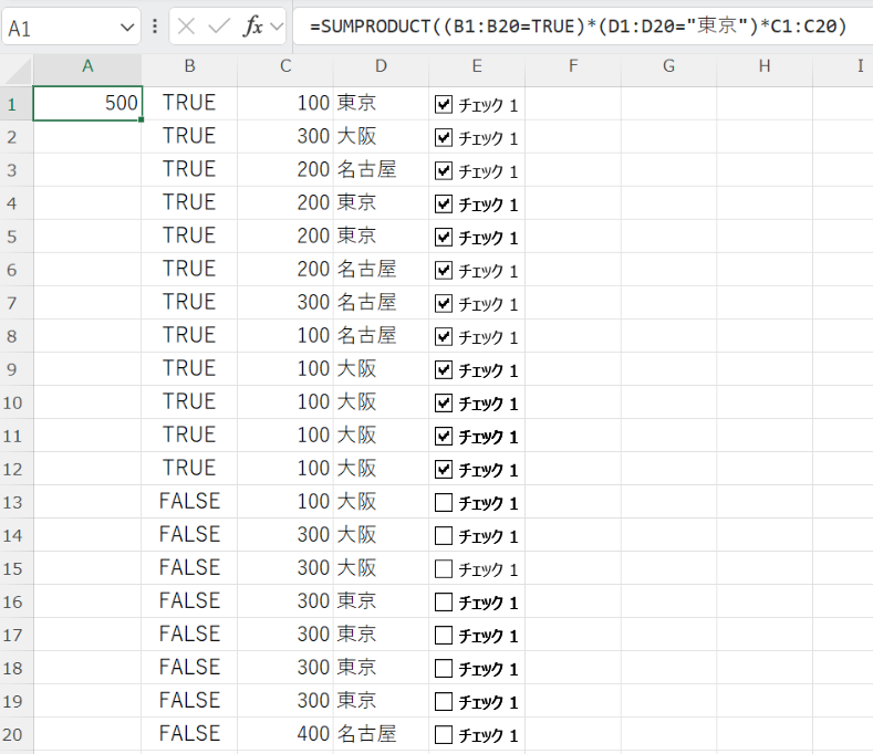 =SUMPRODUCT((B1:B20=TRUE)*(D1:D20=“東京”)*C1:C20)