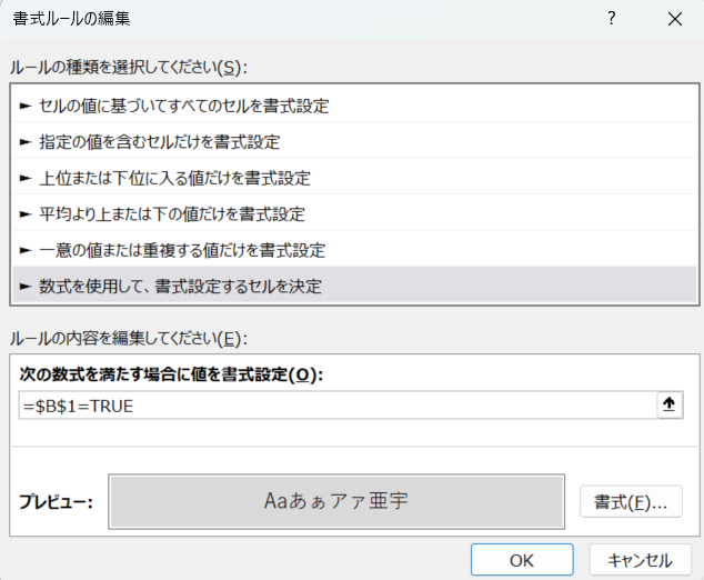 手順4:数式欄に「=$B1=TRUE」と入力する。