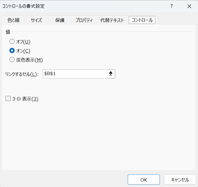 手順2:「コントロール」タブの「リンクするセル」欄を確認する。