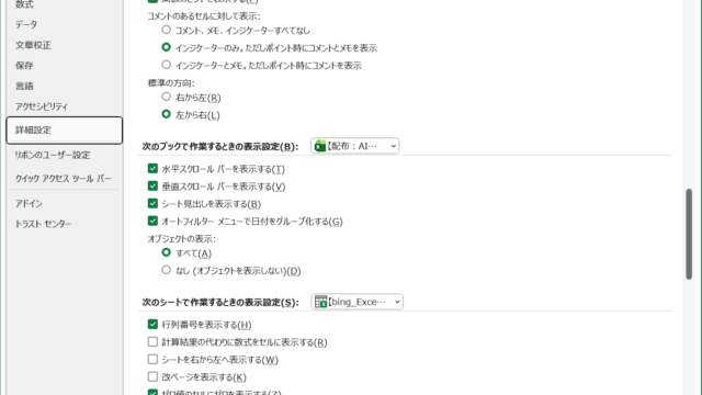 「ファイル」タブをクリックし、「オプション」を選択します。「Excelのオプション」ダイアログが開いたら、左側のメニューから「データ」をクリックします。