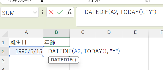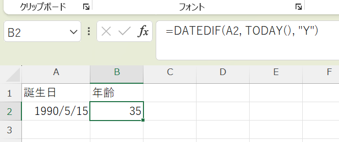 例:A2が「1990/5/15」で今日が「2026/2/21」の場合 → 35(歳)