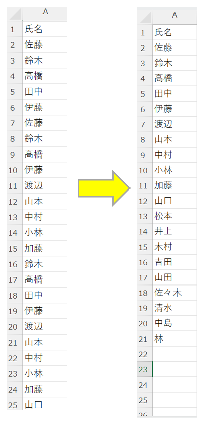 → 氏名が同じ行のうち、最初の1行だけが残される