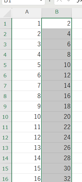 すると、B1からシートの最終データセルまでが選択されますが、もしA列のデータがA1000までなら、B1からB1000あたりまでが選択されます。