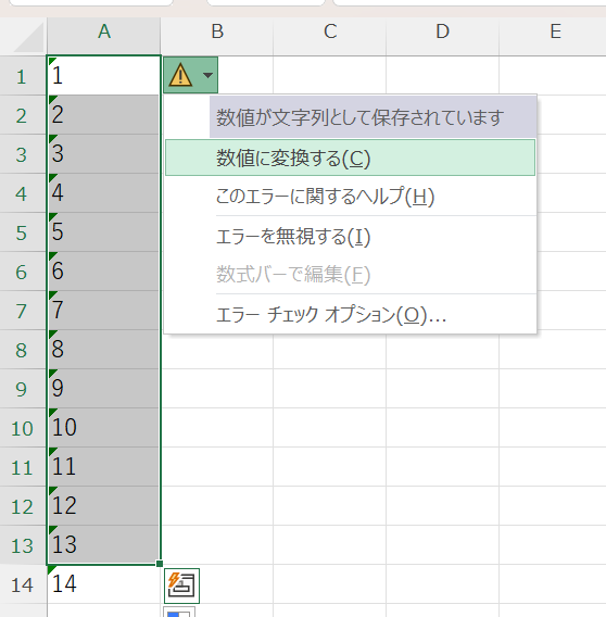 メニューの内容はエラーの種類によって異なりますが、多くの場合、「数値に変換する」「エラーを無視する」「エラーチェックのヘルプ」などの項目が表示されます。