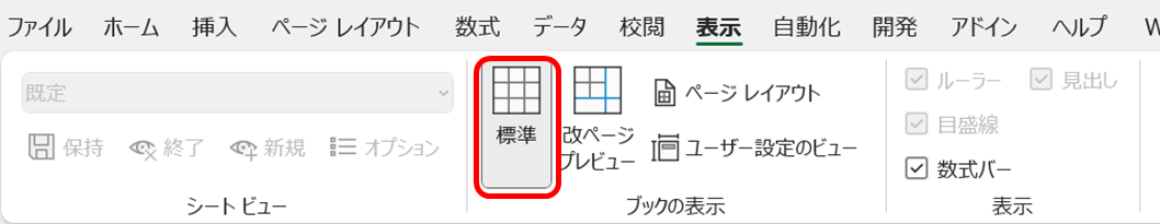 手順2:「ブックの表示」グループの「標準」をクリックする