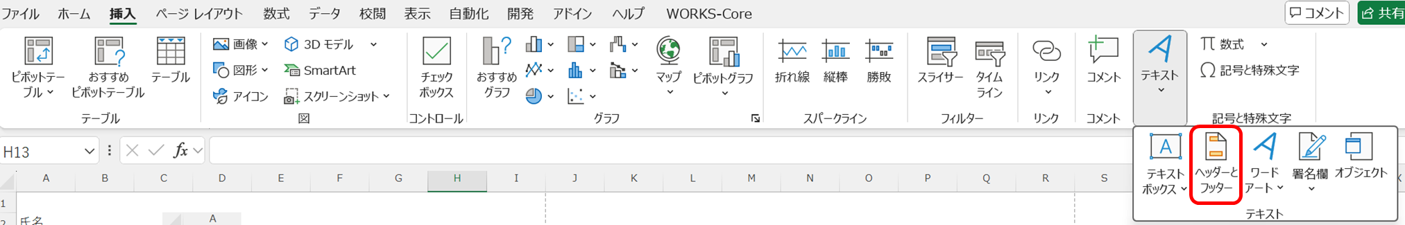 手順1:「挿入」タブ →「テキスト」→「ヘッダーとフッター」をクリックする