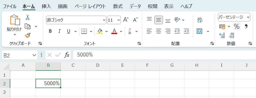 しかし、既に「50」という整数が入力されているセルにパーセント書式を適用すると、50×100=5000で「5000%」と表示されてしまいます。