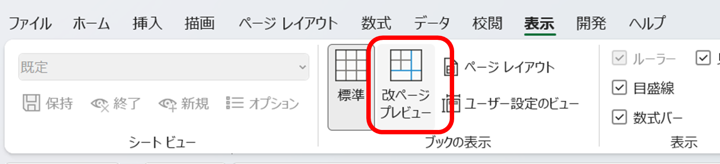 または、リボンの「表示」タブをクリックし、「ブックの表示」グループ内の「改ページプレビュー」をクリックする